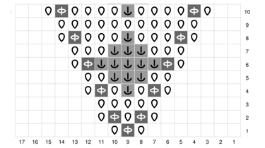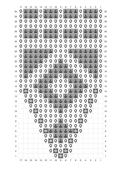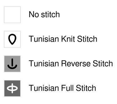 First, familiarise yourself with what each symbol on the chart represents, as stated above. stands for Tunisian Knit Stitch (TKS), stands for Tunisian Reverse Stitch (TRS), and stands for Tunisian Full Stitch (TFS).