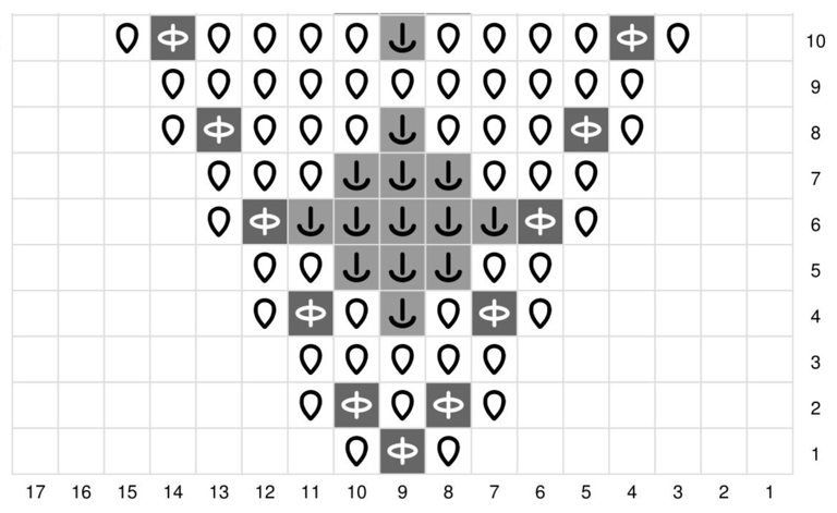 As you can see in the section of chart below all No Float charts contain a number of boxes with symbols such as , and , which represent different stitches. The chart legend below (right) shows what each symbols stands for.